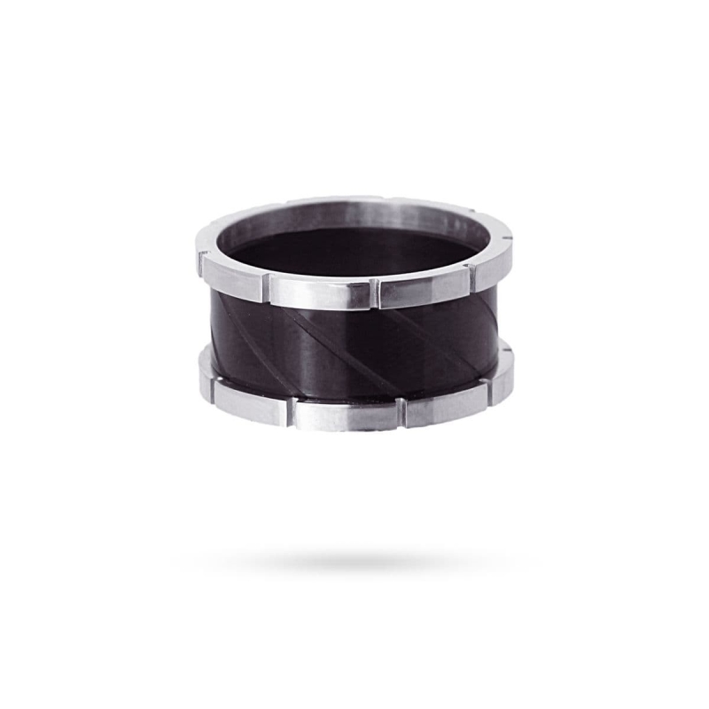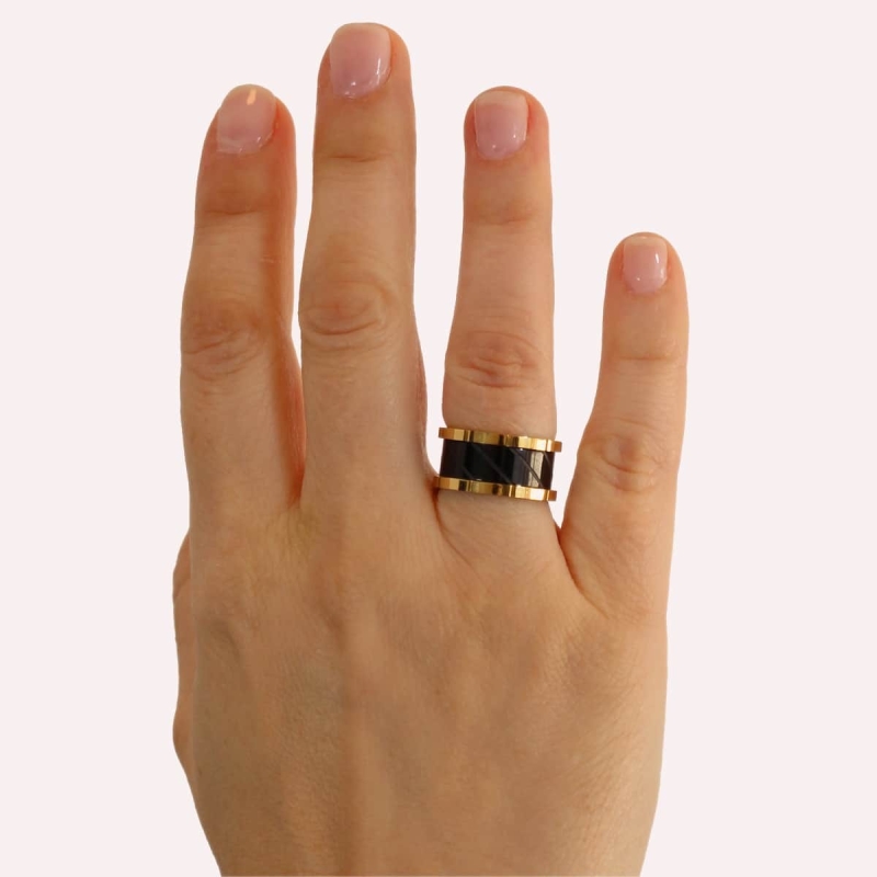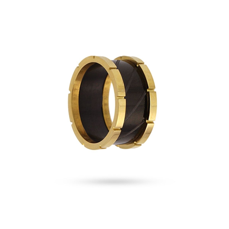 Fabuloso anillo grueso bicolor formado por tres bandas. Rotundo, sofisticado y elegante, es perfecto para llevar con prendas color negro y combinarlo con sus pendientes o pulsera a juego. Es de acero quirúrgico antialérgico y mide 10 mm de grosor.