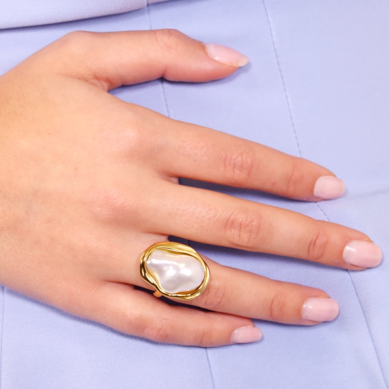 El anillo Pearl es la elección perfecta para agregar un toque elegante y sofisticado a tus manos. Con su acero quirúrgico y maxi perla, este anillo no solo es hermoso sino también exclusivo. Combina con el collar y pendientes a juego en oro o plata para elevar tus looks con estilo y gracia. Hipoalergénico.