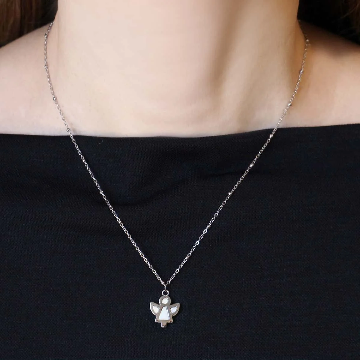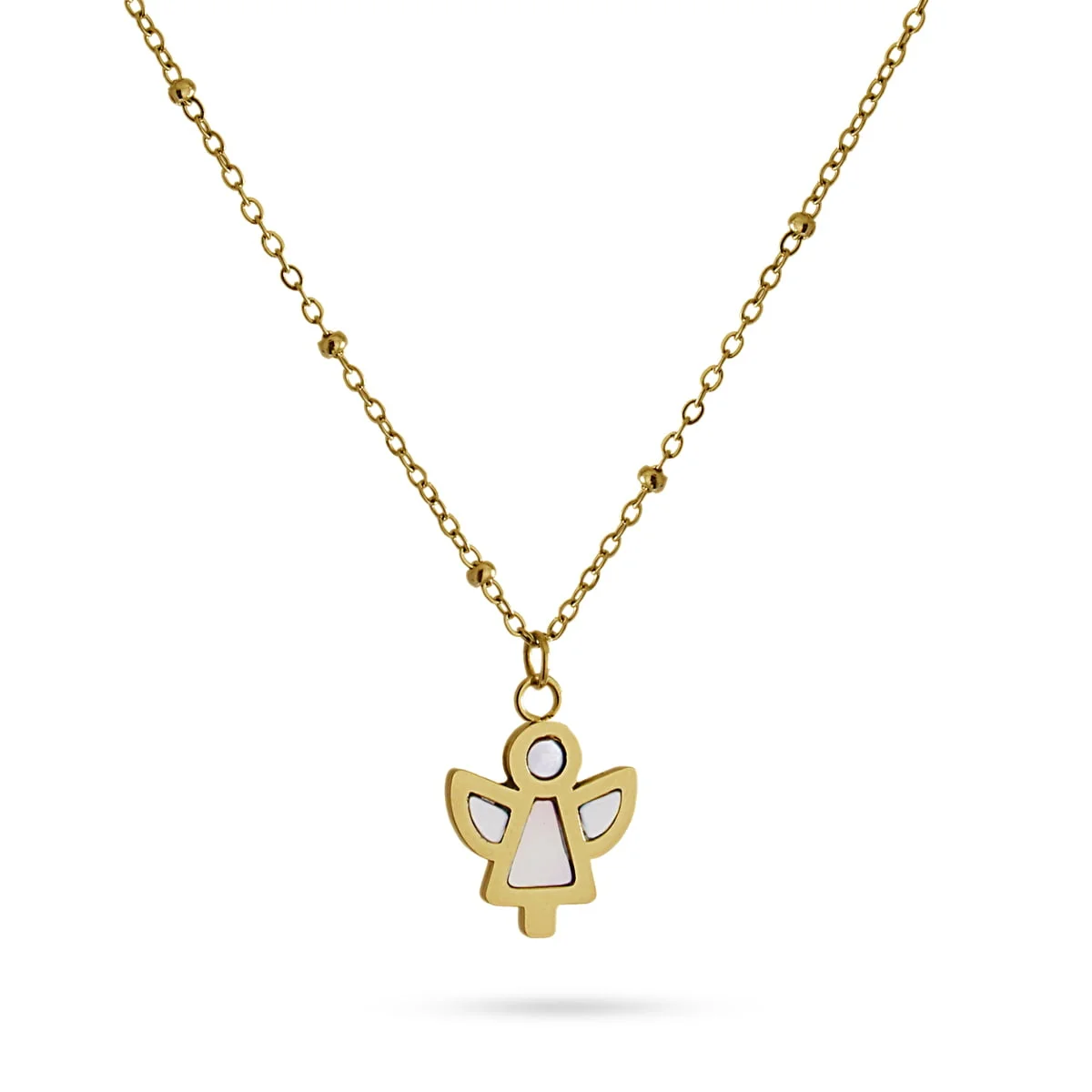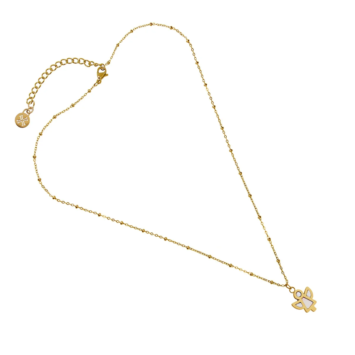 Siente la protección y la elegancia con nuestro collar Jericho. Con colgante en forma de angelito realizado en acero y concha marina, no produce alergias y se puede mojar, para llevarlo todo el año. Cadena ajustable y disponible en dorado y plateado. Lleva siempre tu fe contigo con estilo exclusivo.