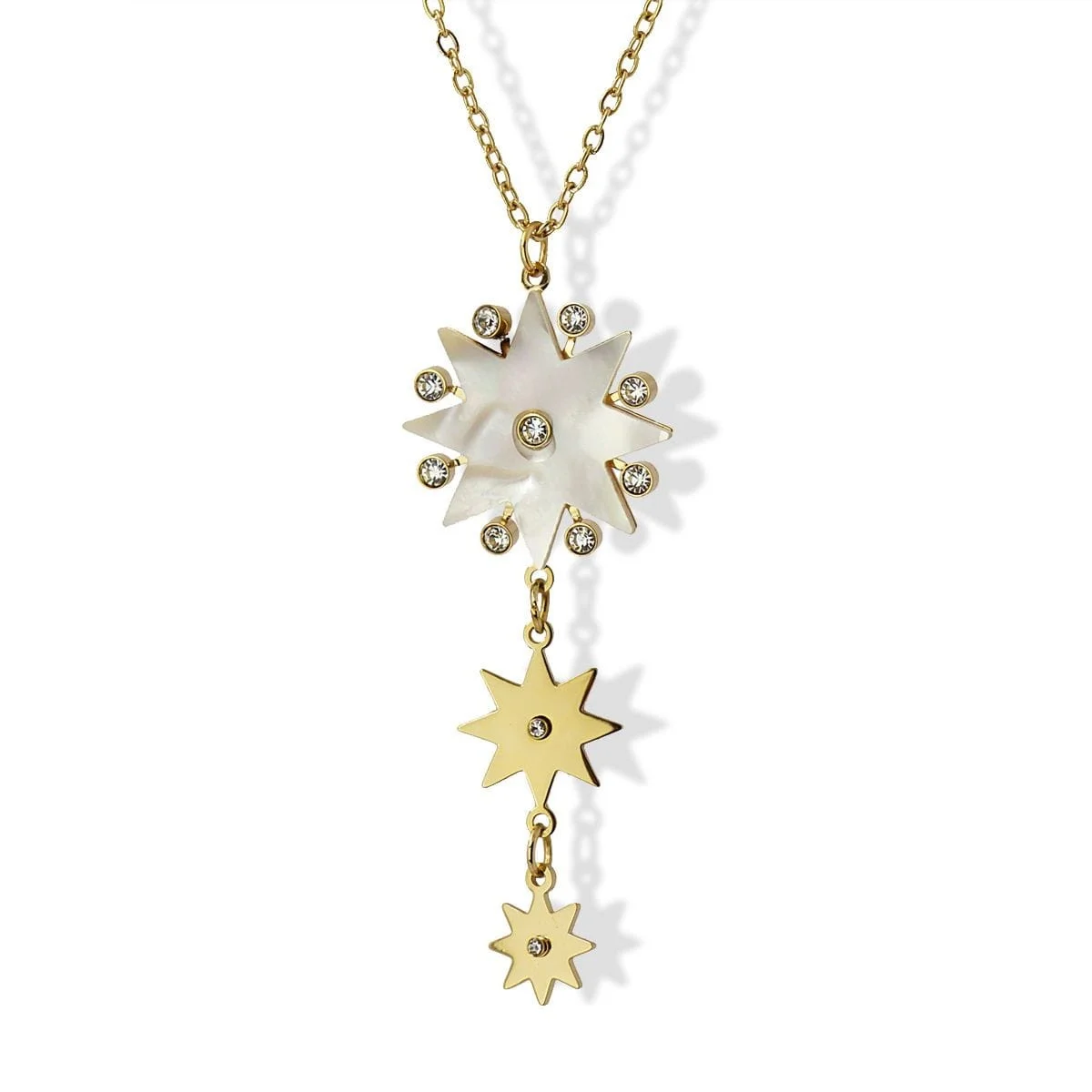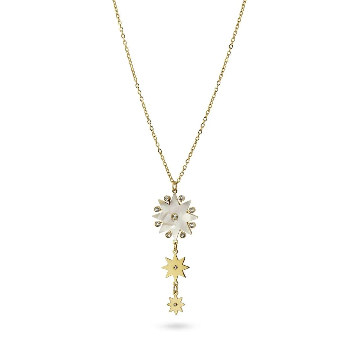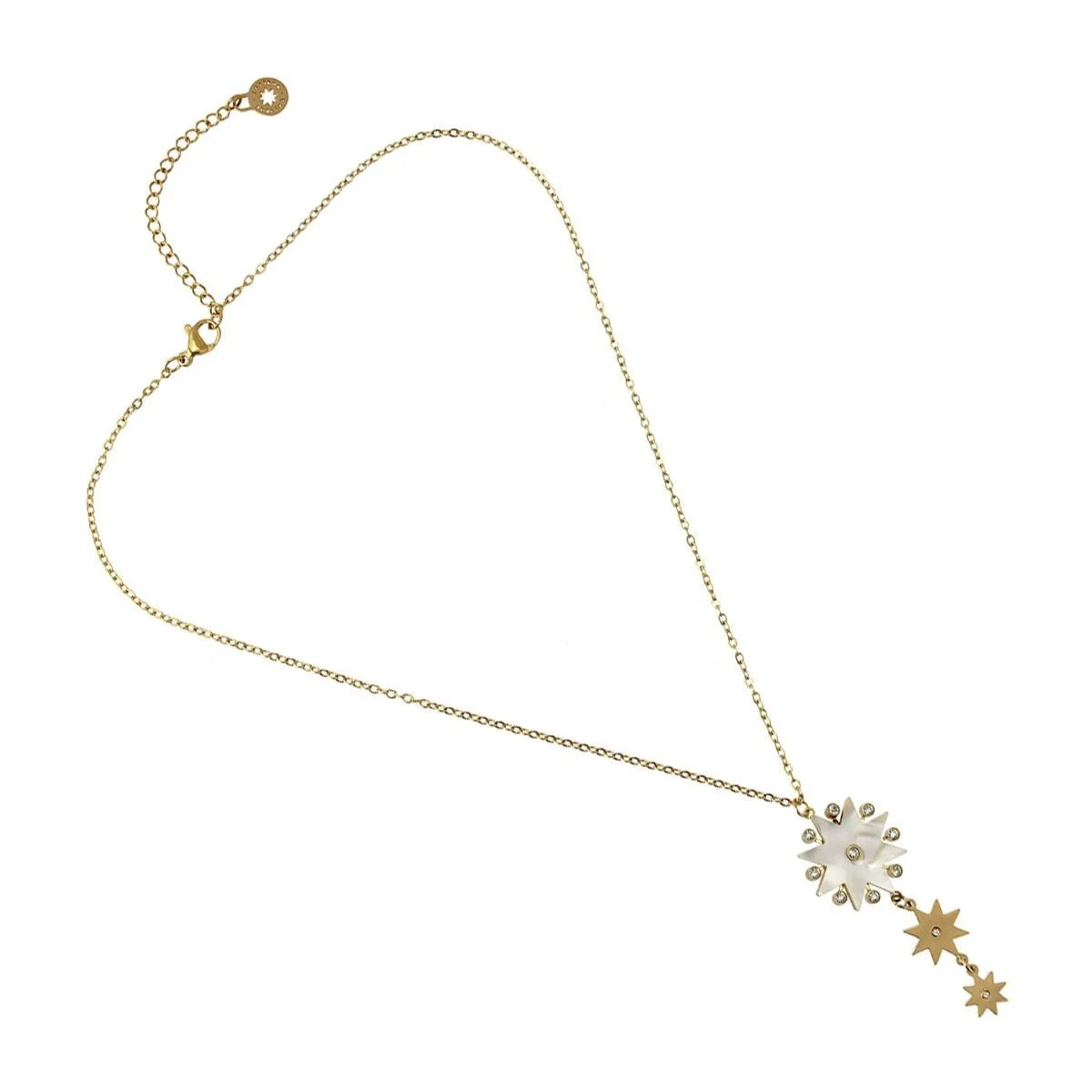 Collar de cadena fina con colgante formado por tres estrellas de diferentes tamaños realizadas en acero quirúrgico dorado, piedra natural y circonitas. Llamativo, original y muy favorecedor es todo lo que necesitas para marcar tendencia. Perfecto para diario pero queda espectacular combinado con pulsera y pendientes a juego para eventos festivos. Disponible en blanco, azul y turquesa. La cadena mide 40 cm y lleva cierre tipo langosta y una extensión de 5 cm para ajustarlo. No provoca alergias.