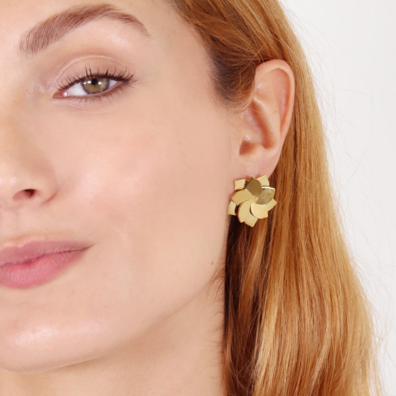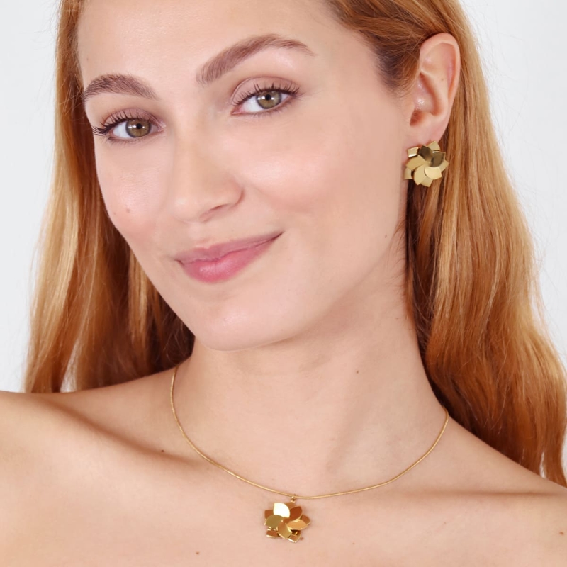 Pendientes Fiorella, el accesorio que te va a encantar. Está inspirado en las flores del árbol limonero y son espectaculares, además de por su diseño, por el brillo del metal y lo favorecedores que son. Realizados en cero quirúrgico color dorado, son ideales para llevar solos o acompañados con su anillo o collar a juego. Lleva cierre a presión y son hipoalergénicos.