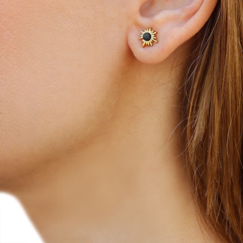 Pendientes pequeños de acero quirúrgico en forma de sol con destellos y centro de piedra natural. Son una preciosidad super favorecedora que podrás combinar con otros accesorios en color oro. Miden 8 mm y llevan pasador con cierre a presión tipo mariposa. Disponibles en color azul, negro y verde. Antialérgicos.